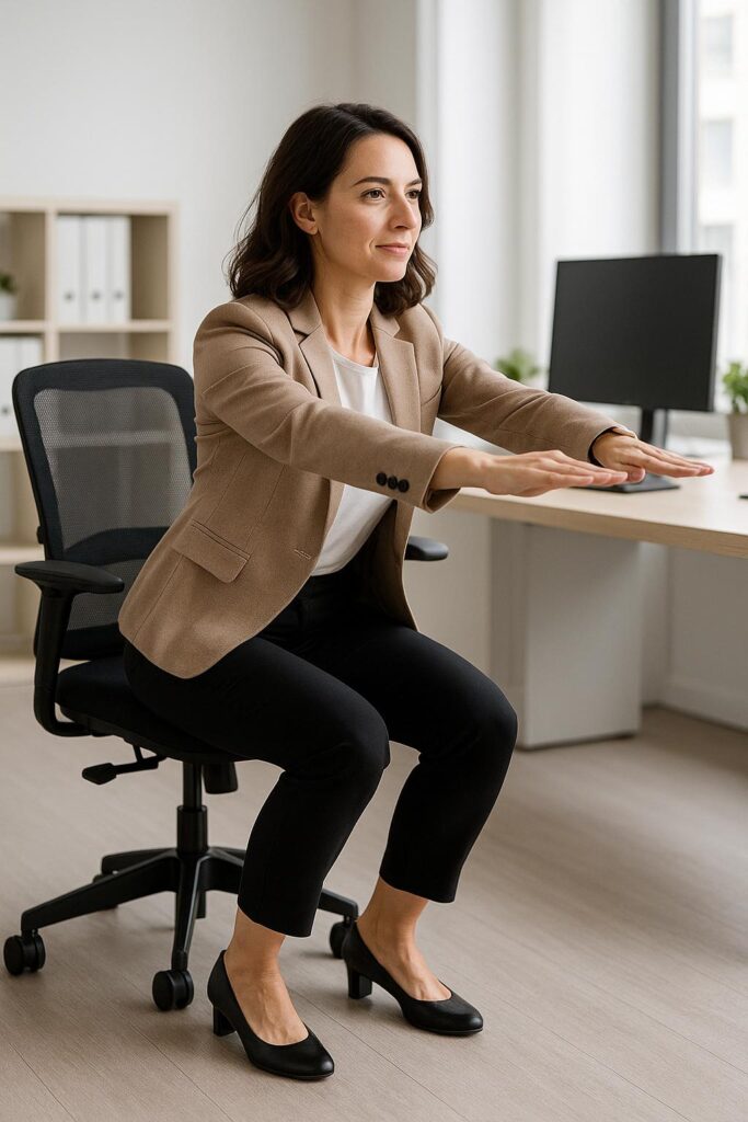 | Calf Raises | 1 minute | Stand and hold onto your chair for balance. Rise up onto your toes, hold for a second, and slowly lower back down. Aim for 30-40 reps. |