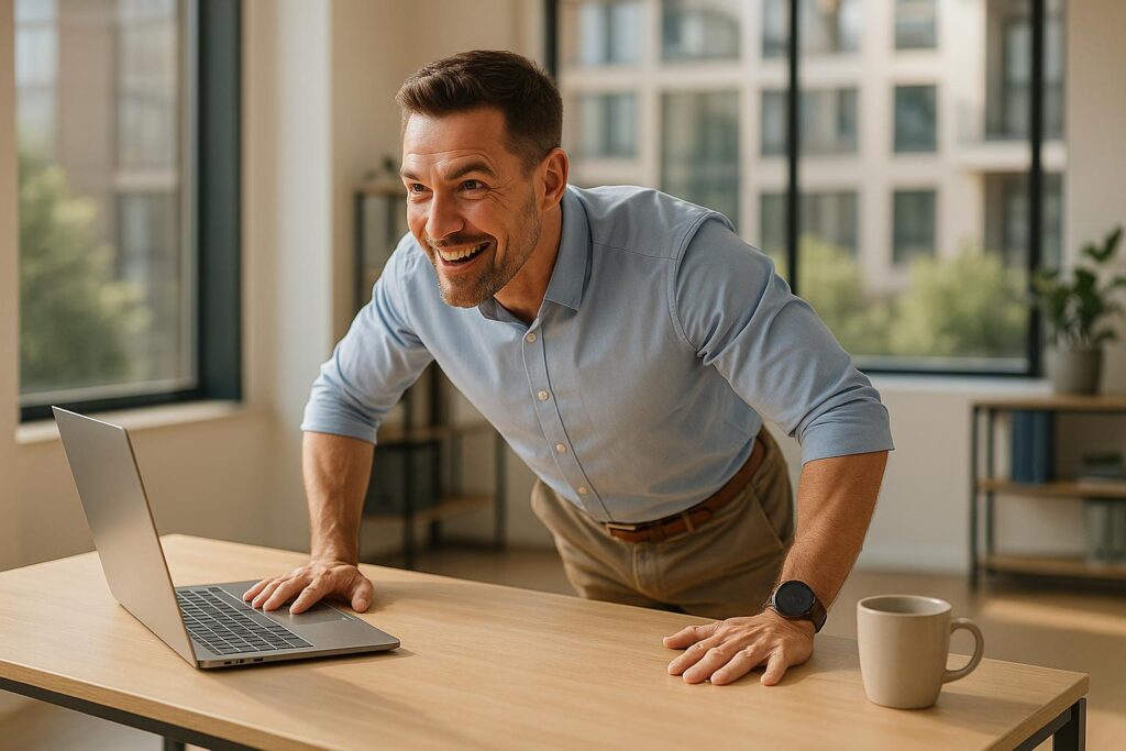 | Desk Push-Ups | 1 minute | Place your hands on the edge of your desk, walk your feet back, and lower your chest towards the desk. Aim for 10-15 reps. |