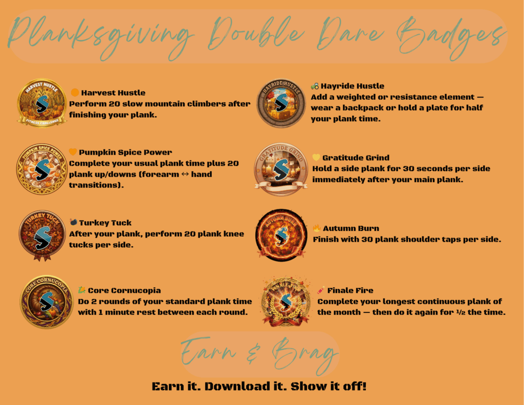 πΈ Badge Tracking: Post your badge completions on social media with #Planksgiving2025, #StudioStrong and the specific badge earned to qualify for bonus prizes!