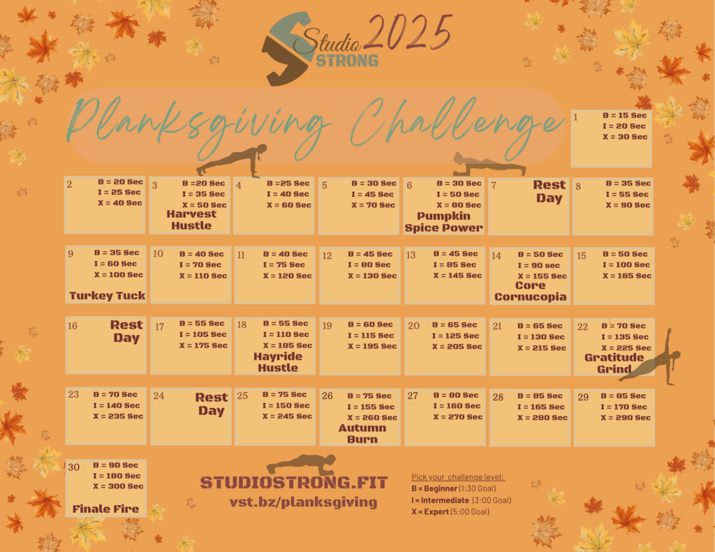 The holidays are approaching fast, and we all know how things can get a little hectic. But this November, Studio Strong invites you to plank through the season with our Planksgiving Challenge 2025! Whether you’re a beginner or an expert, this 30-day challenge will help you stay active, strong, and centeredβone plank at a time.